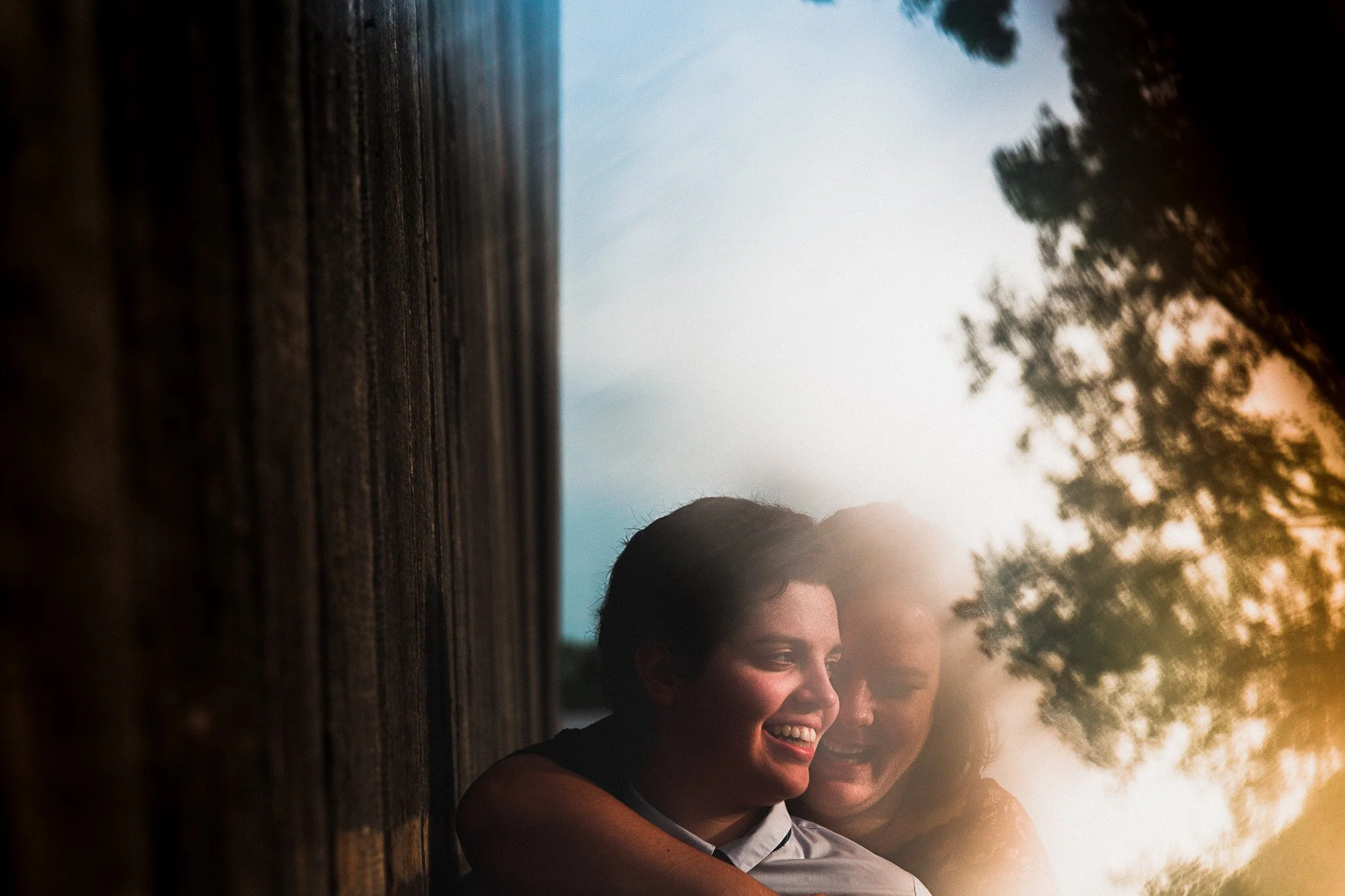 The sun flare is probably the most common lens effect we see in general in photography, and it has a telltale elongated beam of spheres, lines and crescents. They can be hard to control and can create weird light effects on people’s faces and bodies if not careful. Lines are often used in photographic composition and a line of sun flare really isn’t too different as it aims to direct the eye. In the photo below, the light crescent at her elbow serves to set a visual boundary, to bounce the viewer’s eyes back to their faces. Its orange colour also echoes the orange colour of the tree to the left of the couple.
