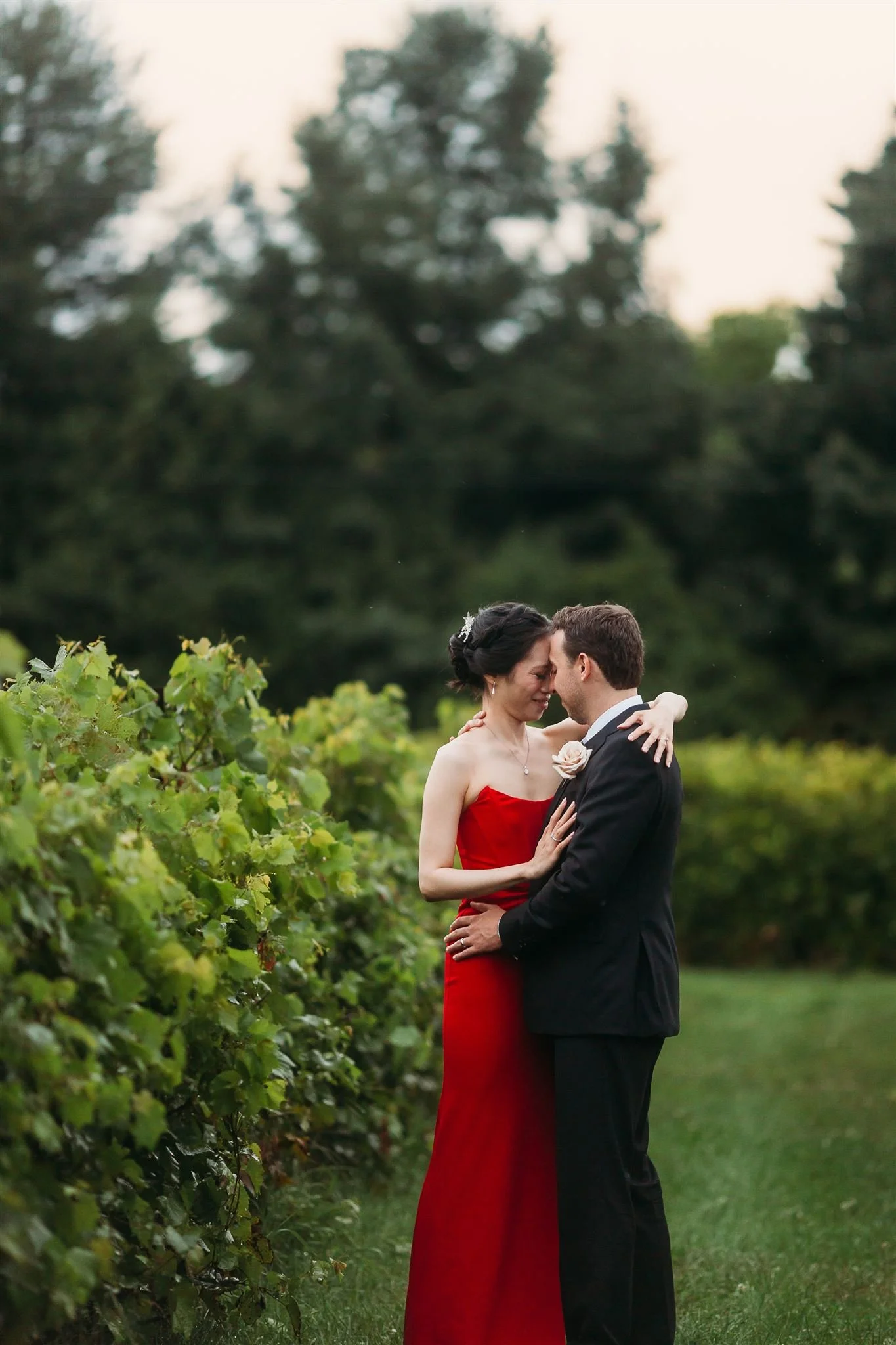 I was challenged professionally to overcome the very rainy circumstances and get creative in framing and keeping us all dry! Equipped with umbrellas and using La Bullerie’s terrasse-tent, we made things work. Around 8pm the skies cleared and the glistening vineyard greens made Sissy’s red reception dress pop as we took advantage of remaining light for some portraits. Because we were limited on that day, the couple and I met up again a week later at Centennial Park in Dollard des Ormeaux for a brief portrait session, on a day where the rain was far away.